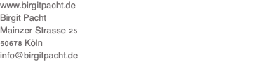 Rechtliches:Der Betreiber dieser Internetseite hat keinerlei Einfluss auf die Gestaltung und die Inhalte verlinkter Seiten. www.birgitpacht.de macht sich Inhalte auf und in externen Links,Sites und Quellen oder Sites oder Quellen die darüber zugänglich sind, nicht zu eigen und schließt jegliche Haftungoder Gewährleistung in Bezug auf diese aus. www.birgitpacht.de kann daher auch weder direkt noch indirekt für Schäden oder Verluste verantwortlich gemacht werden, die aus oder in Zusammenhang mit der Benutzung eines Inhalts oder im Vertrauen auf einen solchen Inhalt oder aufgrund von Waren oder Dienst-leistungen entstehen oder entstanden sind, die über solcheexternen Sites oder Quellen bezogen wurden.